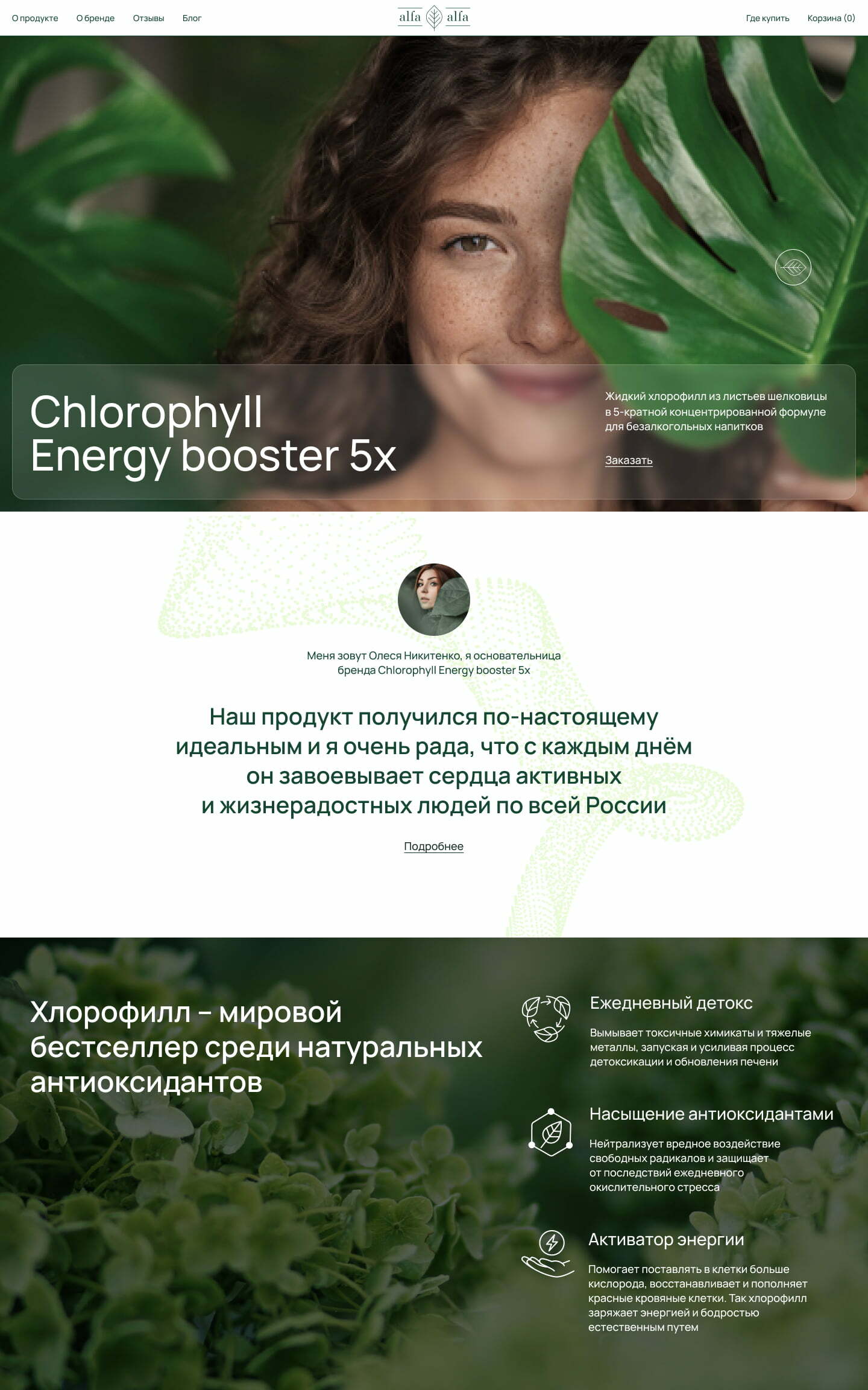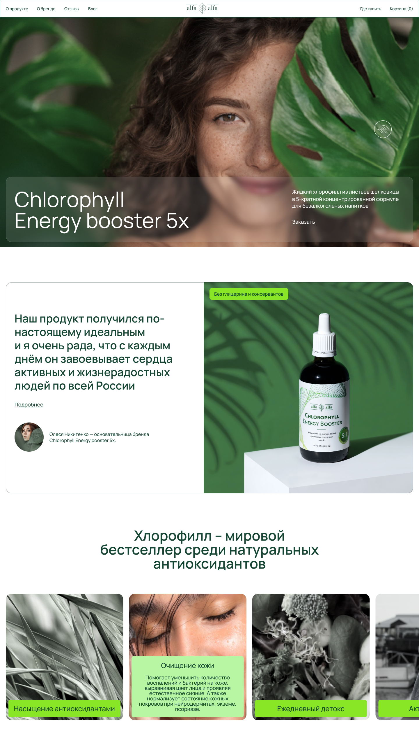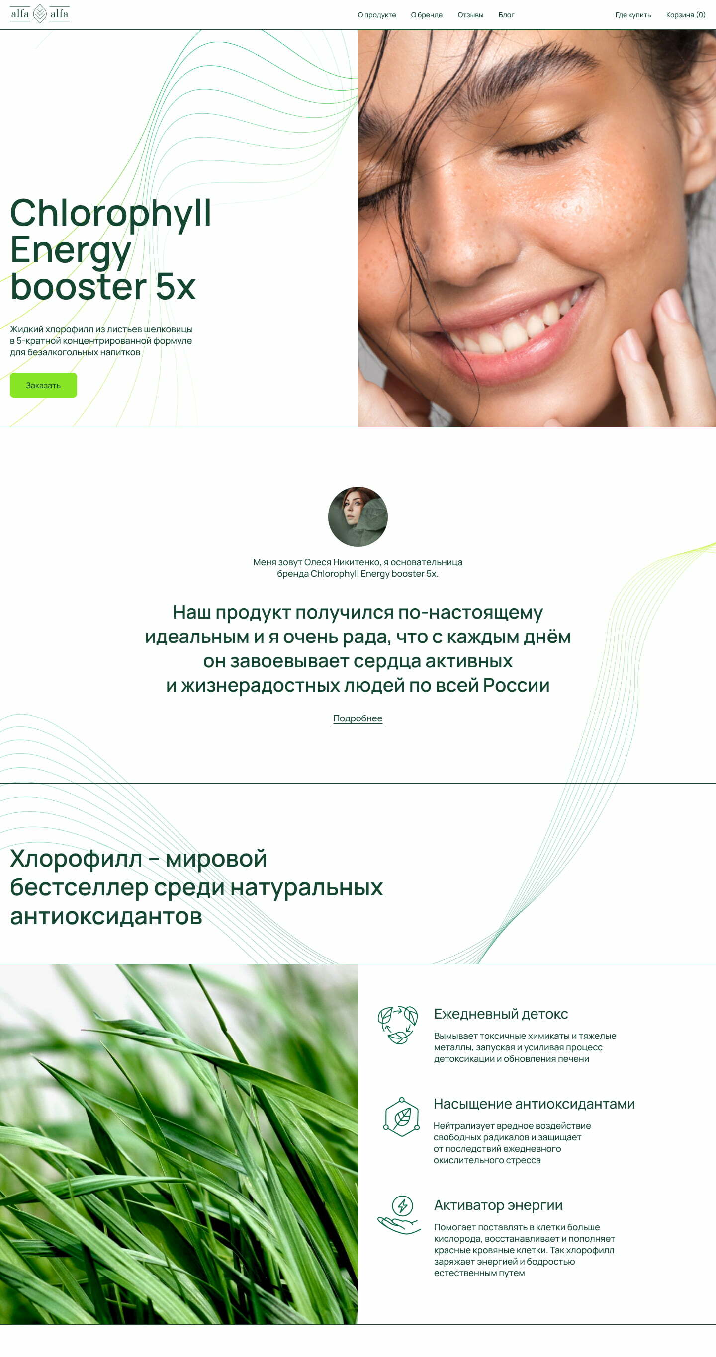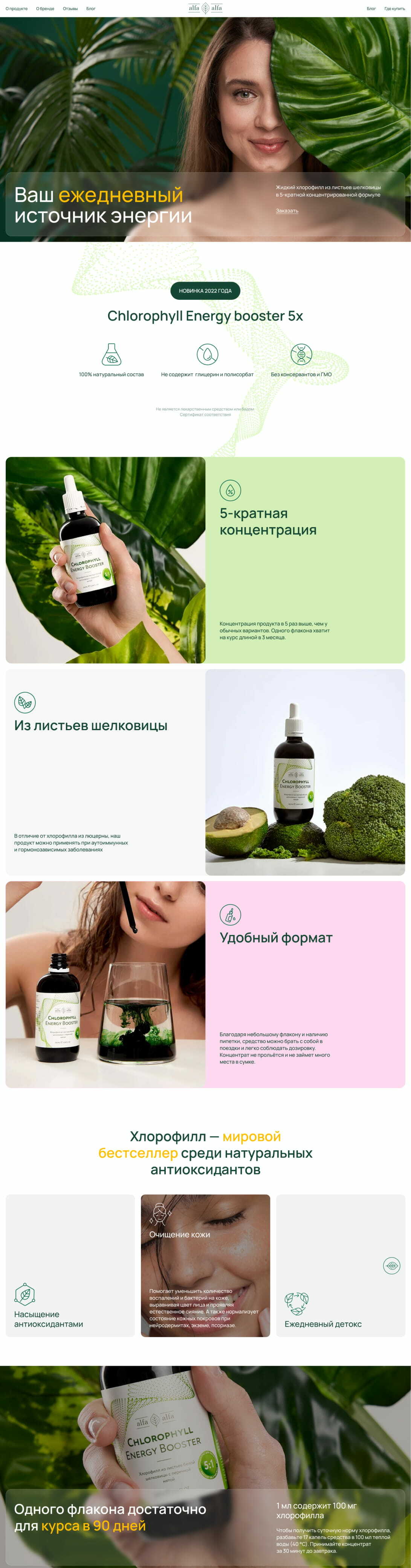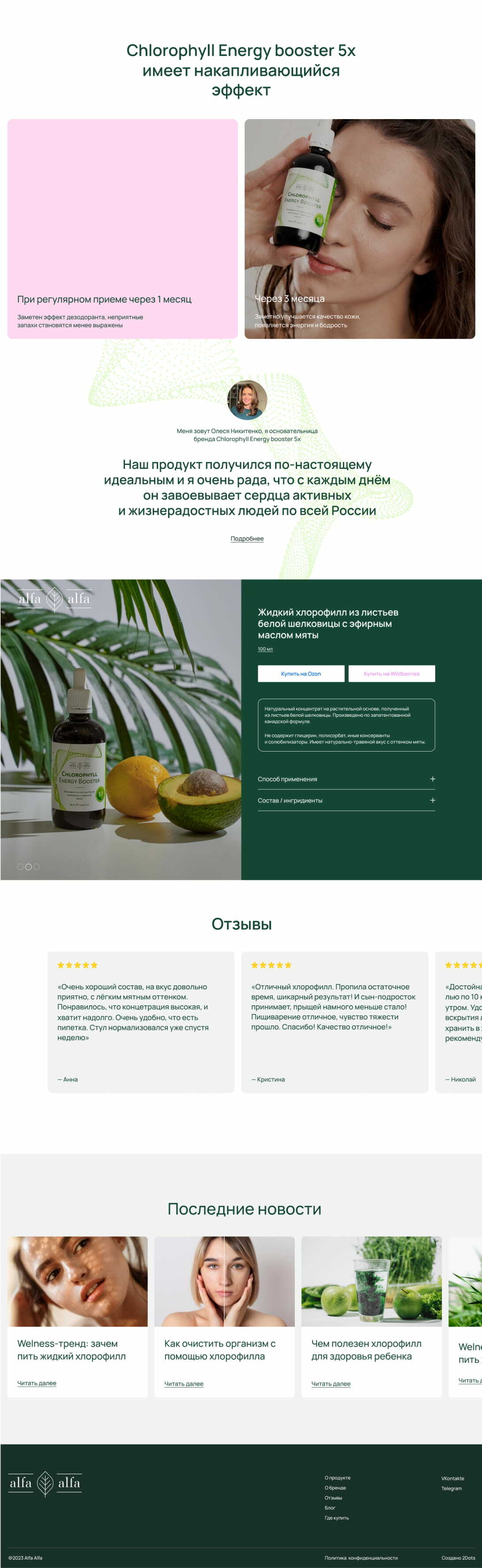 На основании исследований и полученных от клиента текстов мы создали структуру сайта, которая по полочкам разложит всю информацию о продукте: плюсы продукта, плюсы хлорофилла в целом, расскажет о бренде и вызовет доверие к производителю.