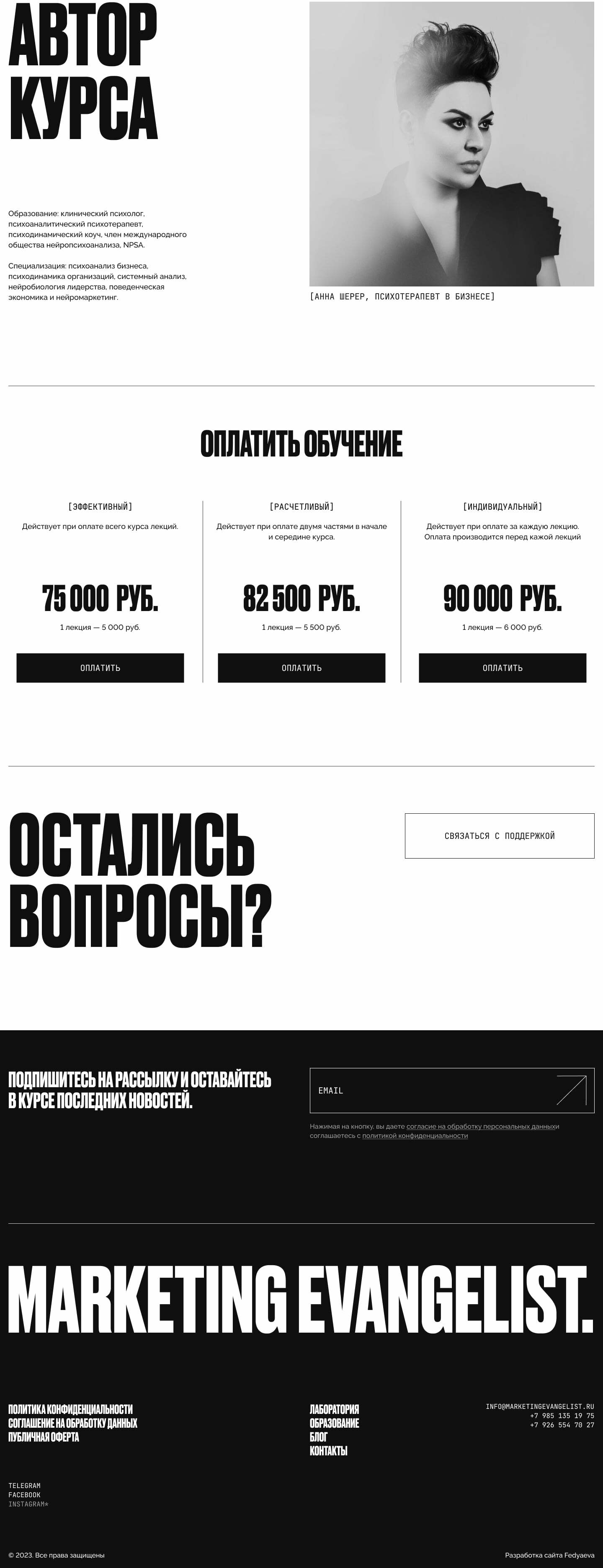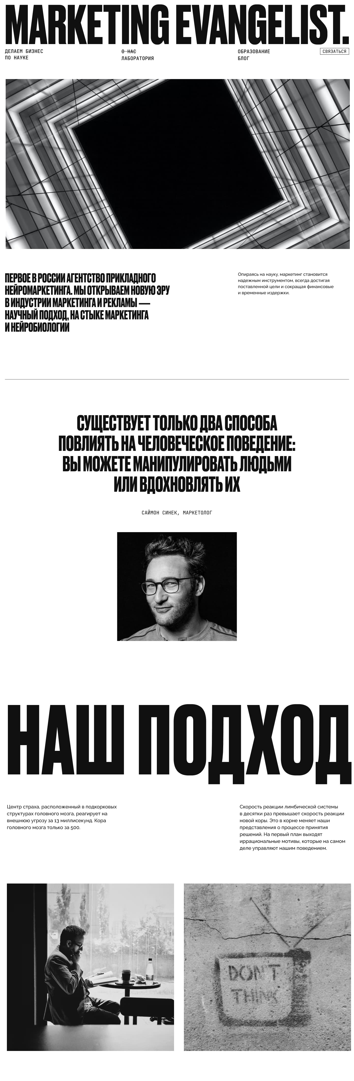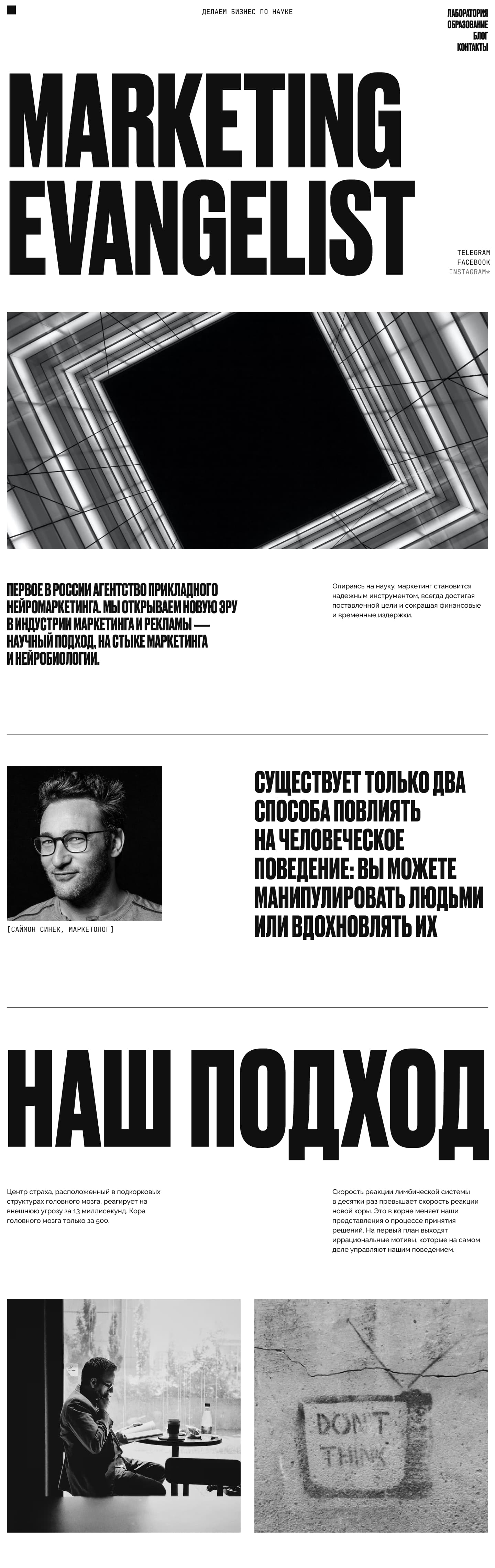В привычном маркетинге маркетологи привыкли полагаться на результаты старых исследований или на тест группы, которые добровольно становятся испытуемыми. Учитывают ли они то, как мы реально принимаем решения? Учитывают ли они психологию и психотипы людей? В подавляющем большинстве — нет. В Marketing Evangelist учитывают все эти факторы и занимаются действительно глубинными исследованиями. А еще учат этому других маркетологов, превращая их в евангелистов бренда.